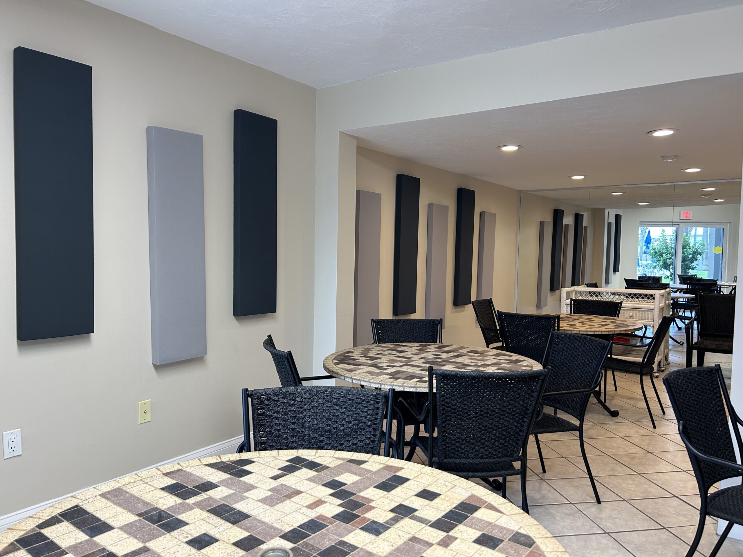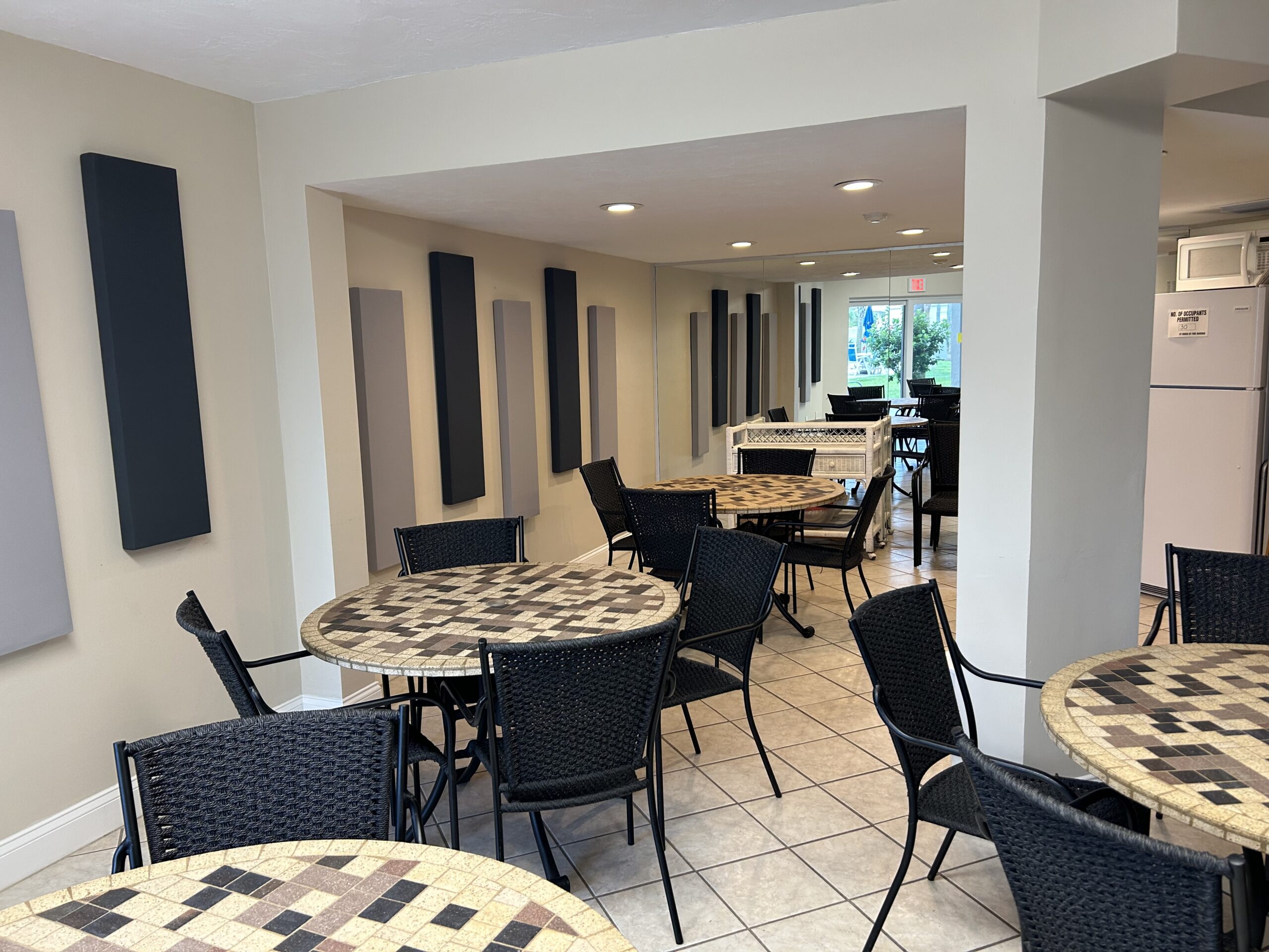 The club room at Twenty Six Twenty Six Condominium provides a welcoming indoor gathering space ideal for social events, casual meetups, or relaxing out of the sun. Featuring multiple bistro-style tables, comfortable woven chairs, and tasteful acoustic wall panels, the room offers a warm, modern atmosphere. Large windows bring in natural light, while the open layout makes it easy for residents to host group activities, play games, or enjoy community functions. Whether used for private gatherings or organized events, the club room adds a versatile, comfortable hub to the condominium’s amenities.